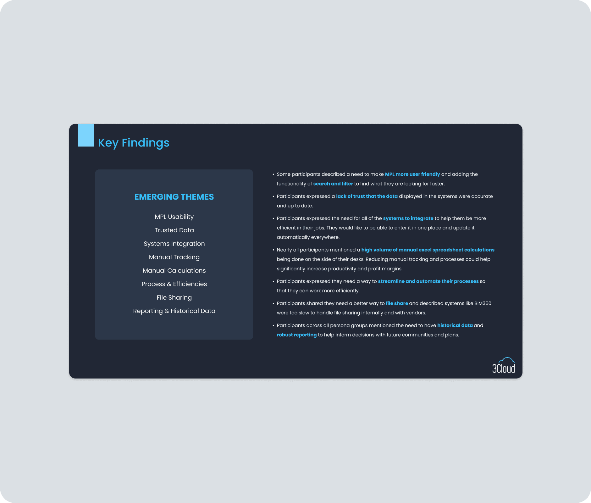 Highland Homes recognized a strategic opportunity to redefine their internal application system (MPL) to better support their rapid growth. The mission was to move toward a highly integrated, modern data platform that would empower employees across seven different departments. We saw this as a chance to conduct deep-dive research that would bridge operational gaps and create a "Single Source of Truth," allowing the organization to operate with greater accuracy and speed.