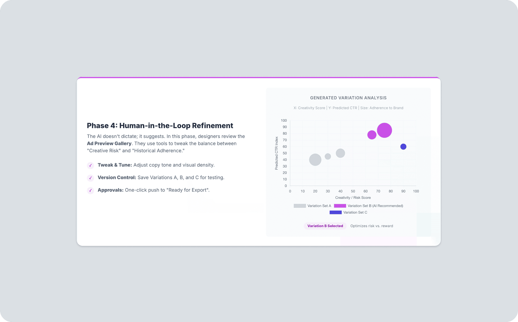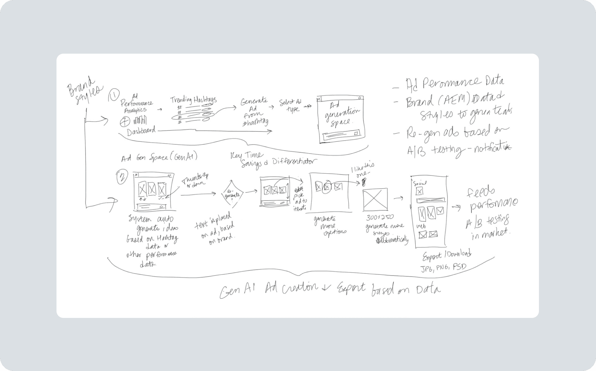 Working closely with the client and our engineering partners, we prioritized stakeholder empathy to deeply understand the creative roadblocks. We shifted the focus toward rapid prototyping, allowing us to visualize the vision and build alignment quickly. Our team developed an AI-driven platform that automates the production of concept ads with unparalleled speed. By leveraging generative design patterns, we empowered the agency’s creative teams to scale ideas faster than ever before, ensuring that technology served to amplify—rather than replace—human creativity.